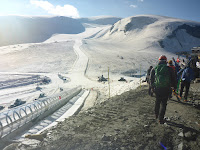 Nos calzamos crampones y piolets nada más salir, pues damos directamente al glaciar. Muy cerca hay varias pistas de esquí que disfrutan de nieve durante todo el año. La primera mitad de nuestra ruta trata de progresar entre las pistas de esquí hasta la altura del Klein Matterhorn. Por lo que ponemos la directa en esa dirección.