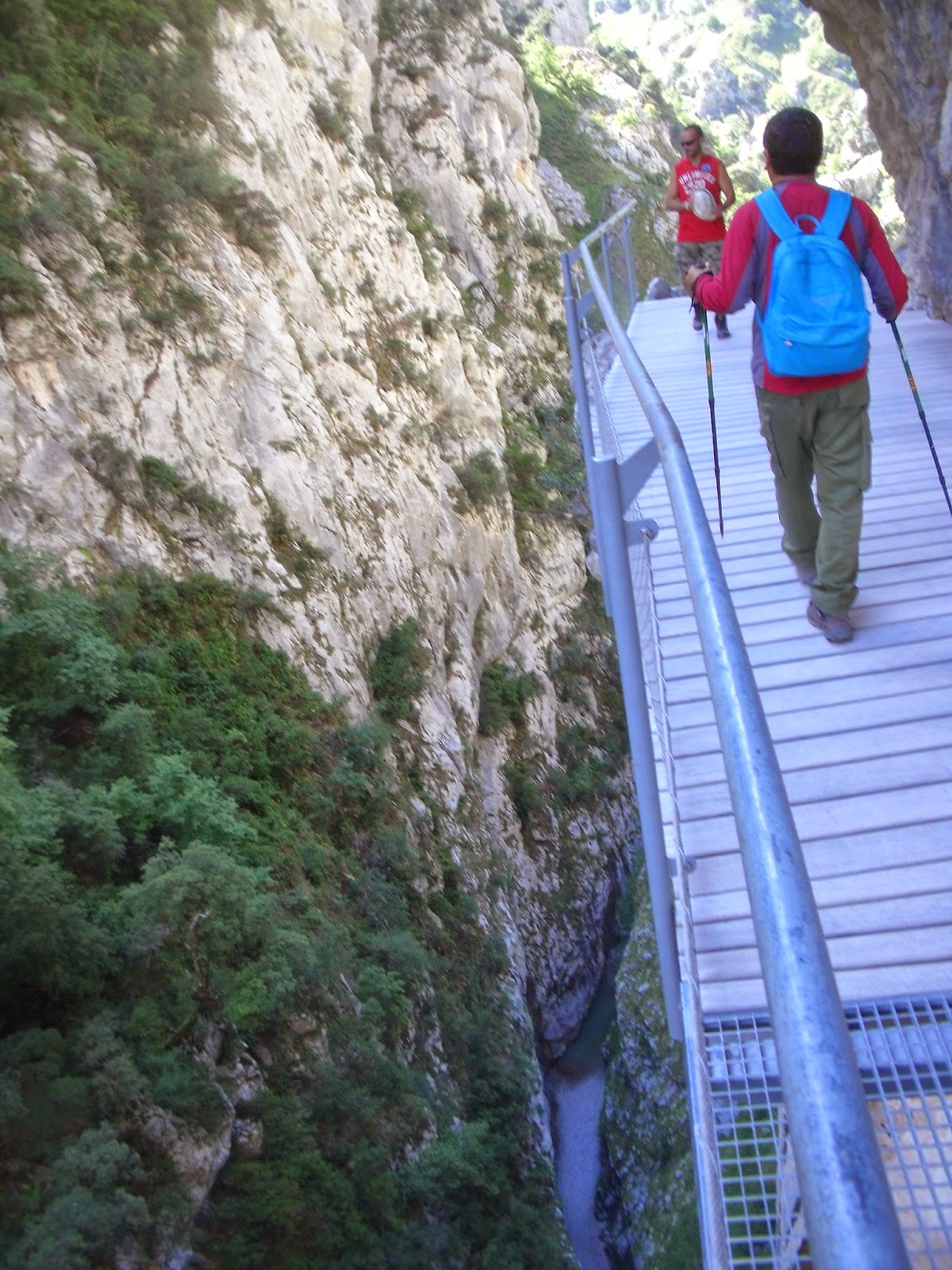 El punto culminante de la ruta del Cares, si hay que poner alguno como tal, es el paso reconstruido hace pocos años por un desprendimiento. Se rehizo el paso del sendero mediante una pasarela de madera y metal en el punto más aéreo de caída sobre el río, en el corazón del congosto. Es una vista impresionante.